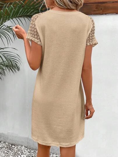 SHEIN Frenchy Contrast Lace Raglan Sleeve Button Front Dress