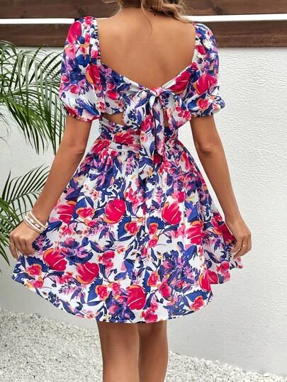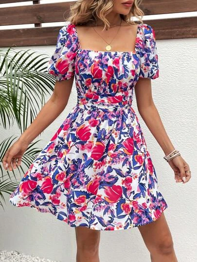SHEIN Frenchy Floral Print Square Neck Puff Sleeve Dress