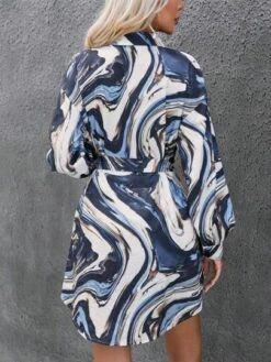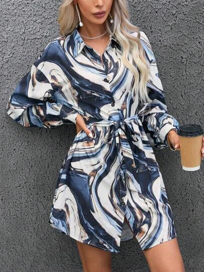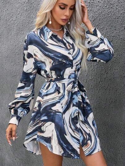 SHEIN Frenchy Marble Print Belted Shirt Dress