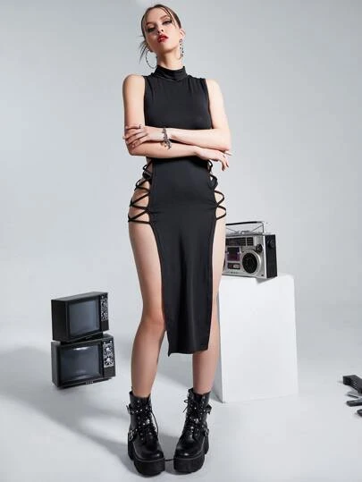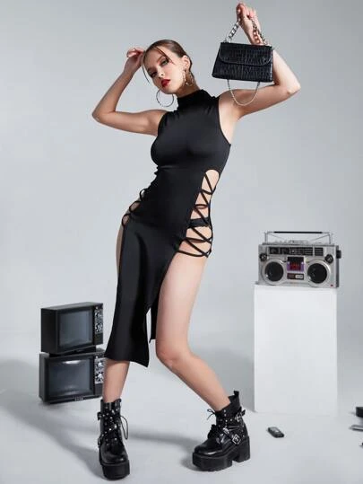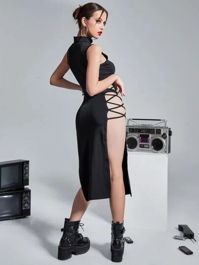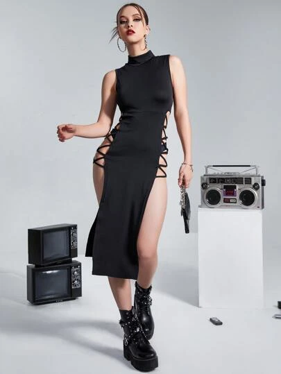 SHEIN ICON Mock Neck Lace Up Side Split Thigh Dress Without Panty