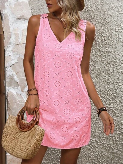 SHEIN LUNE Guipure Lace Panel Eyelet Embroidery Tank Dress