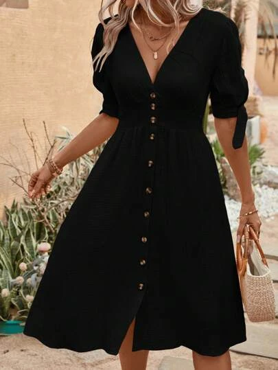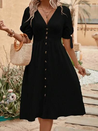SHEIN LUNE Solid Button Front A-line Dress