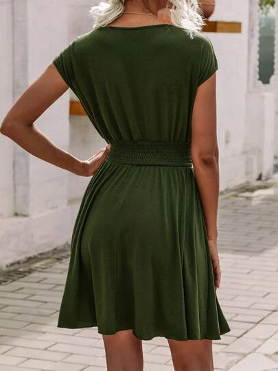 SHEIN LUNE Solid Surplice Neck Shirred Detail A-line Dress