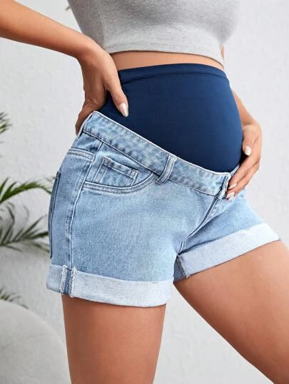 SHEIN Maternity Adjustable Elastic Waist Roll Up Hem Denim Shorts