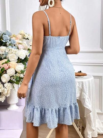 SHEIN Maternity Allover Plants Print Ruffle Trim Wrap Knot Side Cami Dress