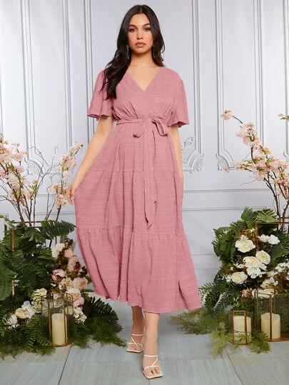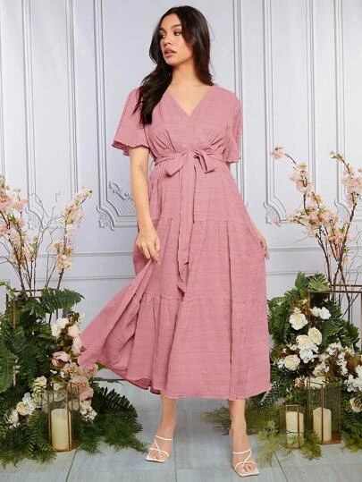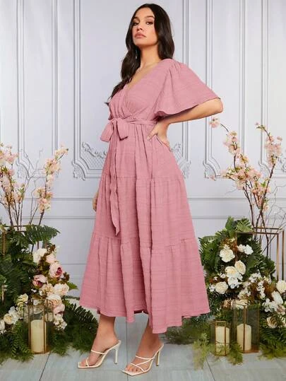 SHEIN Maternity Butterfly Sleeve Ruffle Hem Belted Dress