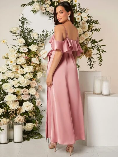 SHEIN Maternity Cold Shoulder Knot Side Wrap Hem Satin Dress
