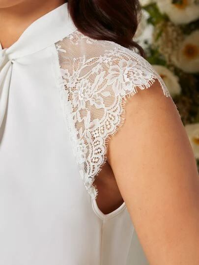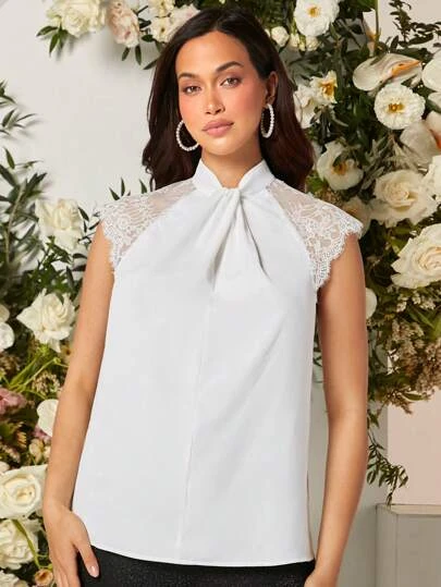 SHEIN Maternity Contrast Lace Raglan Sleeve Twist Front Keyhole Back Blouse
