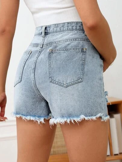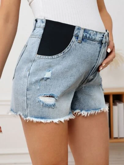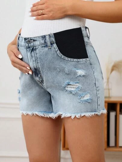 SHEIN Maternity Contrast Panel Ripped Raw Cut Denim Shorts