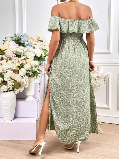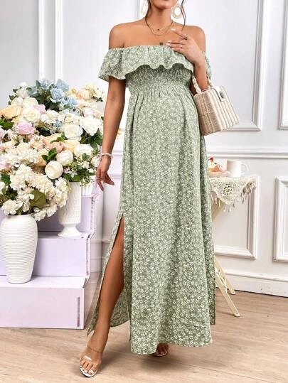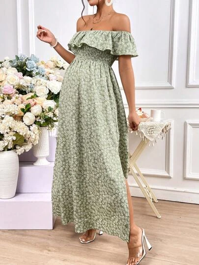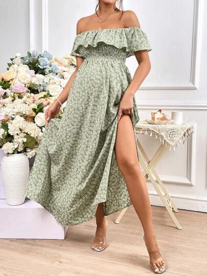 SHEIN Maternity Ditsy Floral Print Off Shoulder Ruffle Trim Split Thigh Dress