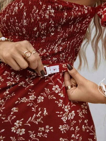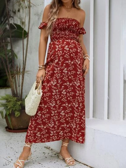 SHEIN Maternity Ditsy Floral Print Off Shoulder Top & Split Thigh Skirt