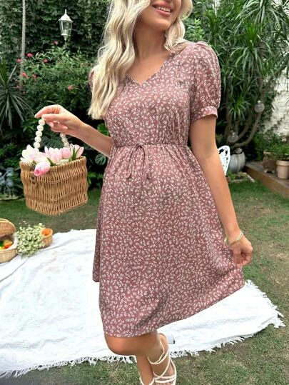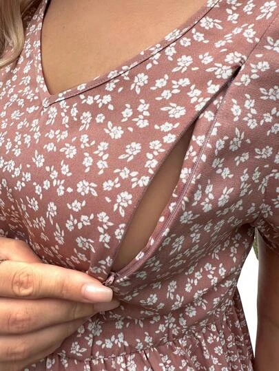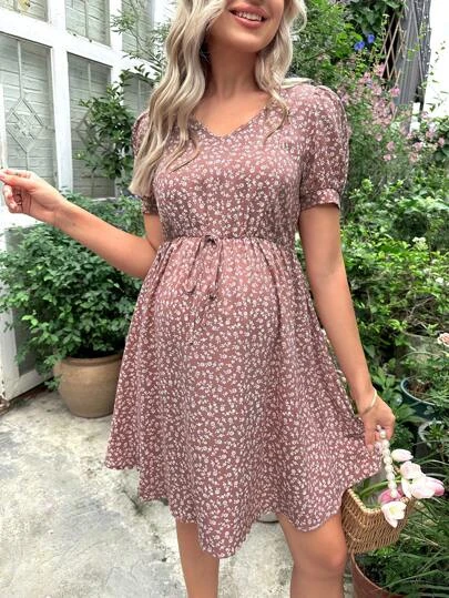 SHEIN Maternity Ditsy Floral Print Puff Sleeve Knot Front Dress