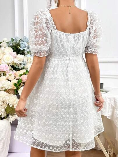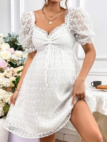 SHEIN Maternity Drawstring Front Frill Trim Puff Sleeve Embroidery Mesh Dress