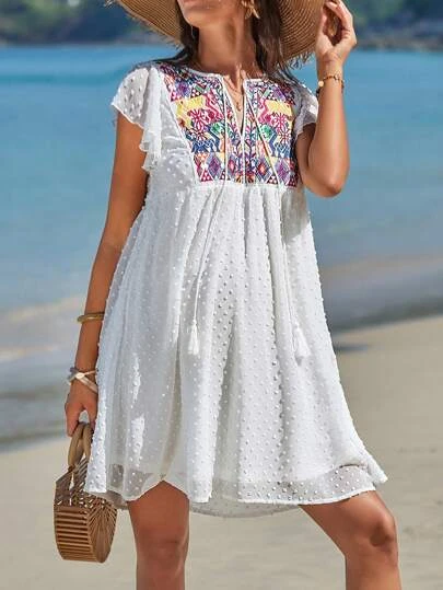 SHEIN Maternity Floral Embroidery Butterfly Sleeve Swiss Dot Smock Dress