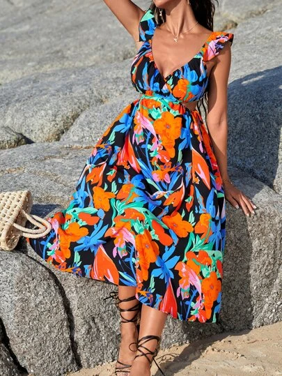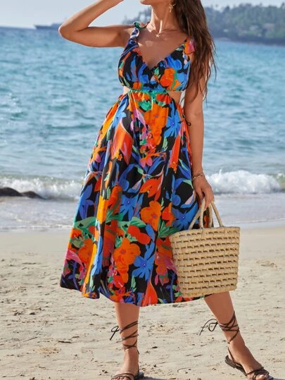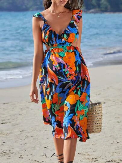 SHEIN Maternity Floral Print Cutout Waist Ruffle Trim Dress