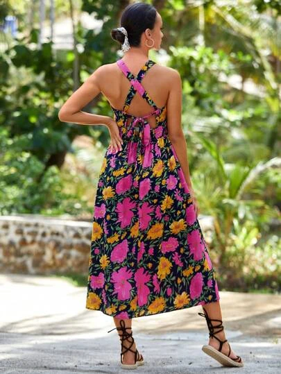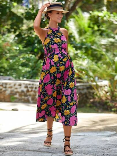 SHEIN Maternity Floral Print Halter Neck Dress