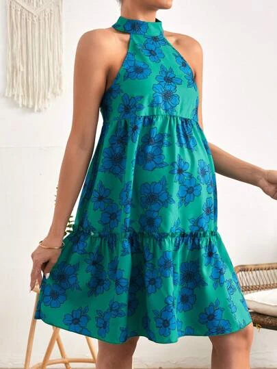 SHEIN Maternity Floral Print Ruffle Hem Halter Dress