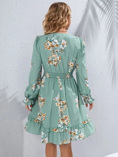 SHEIN Maternity Floral Print Shirred Tie Front Flounce Sleeve Ruffle Hem Dress