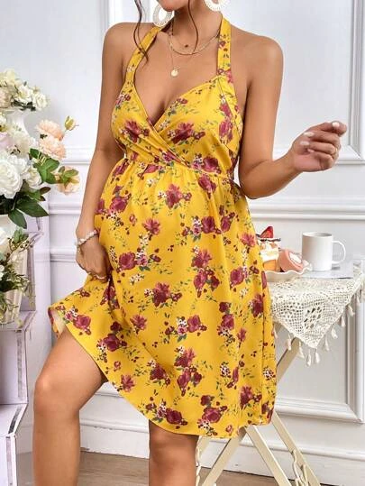 SHEIN Maternity Floral Print Tie Backless Halter Dress