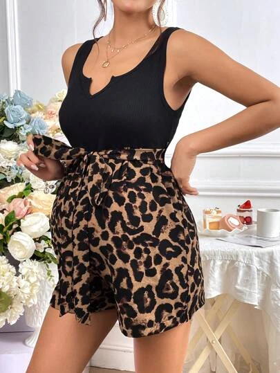 SHEIN Maternity Leopard Print Notched Neck Belted Romper