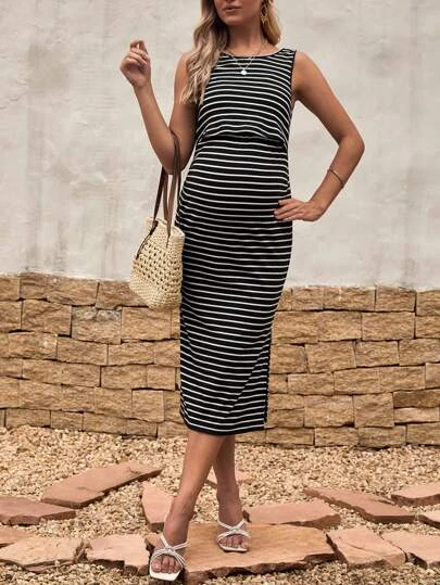 SHEIN Maternity Nursing Striped Print Split Hem Dress