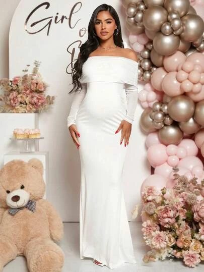 SHEIN Maternity Off Shoulder Foldover Front Floor Length Dress
