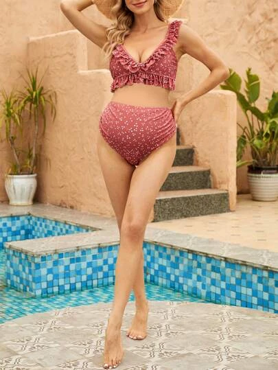 SHEIN Maternity Polka Dot Print Ruffle Trim Bikini Swimsuit