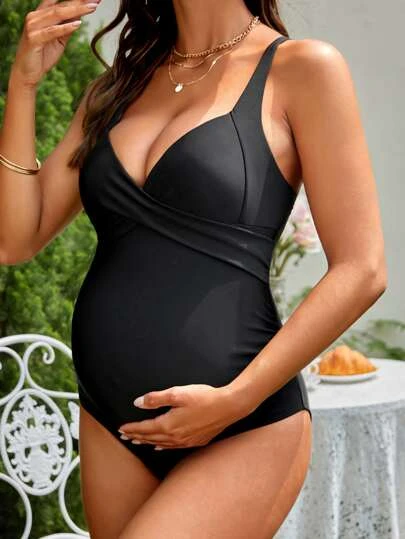 SHEIN Maternity Solid Criss-cross Back One Piece Swimsuit