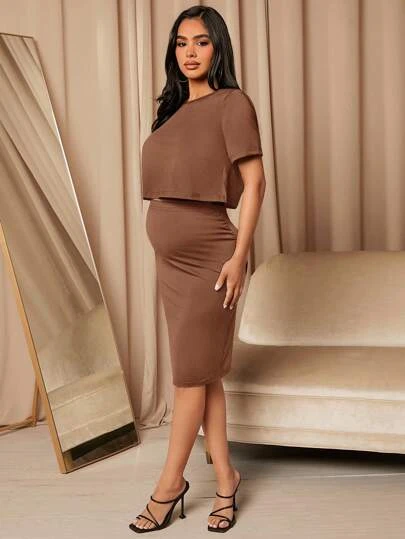 SHEIN Maternity Solid Crop Tee & Adjustable Waist Skirt Set