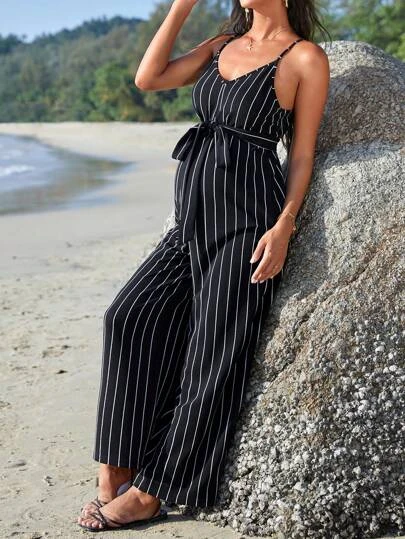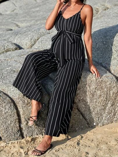 SHEIN Maternity Striped Print Belted Cami Jumpsuit