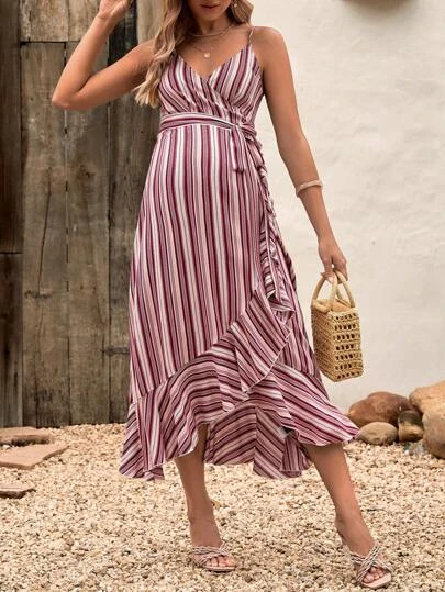 SHEIN Maternity Striped Print Ruffle Hem Belted Cami Dress