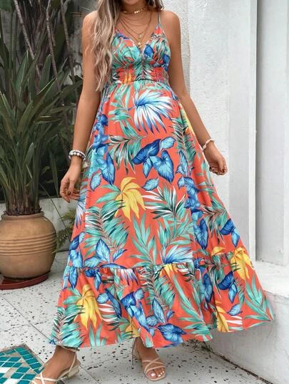 SHEIN Maternity Tropical Print Crisscross Backless Ruffle Hem Cami Dress