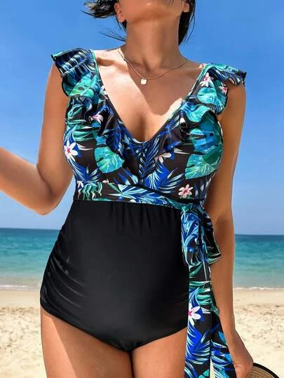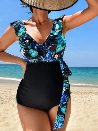 SHEIN Maternity Tropical Print Ruffle Trim Knot Side One Piece Swimsuit