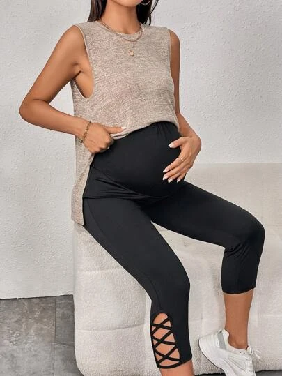 SHEIN Maternity Wide Waistband Criss Cross Hem Capri Leggings