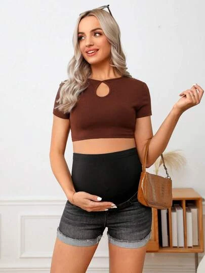 SHEIN Maternity Wide Waistband Roll Up Hem Denim Shorts