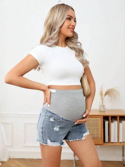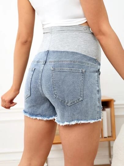 SHEIN Maternity Wideband Waist Ripped Raw Hem Denim Shorts