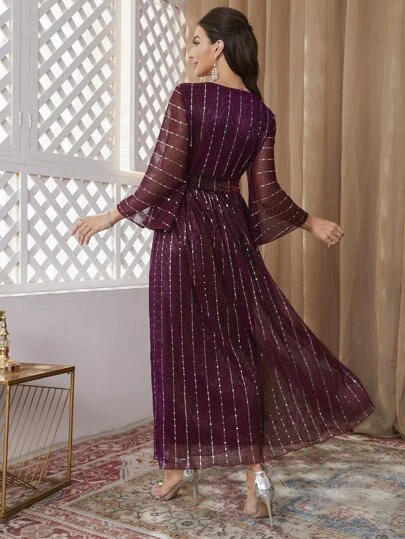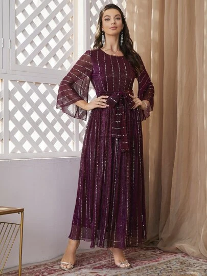 SHEIN Modely Flounce Sleeve Belted Sequins Dress