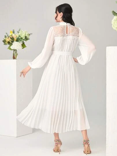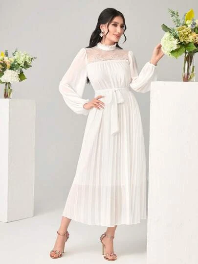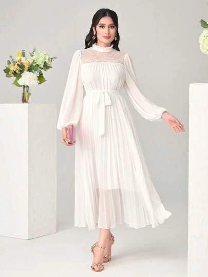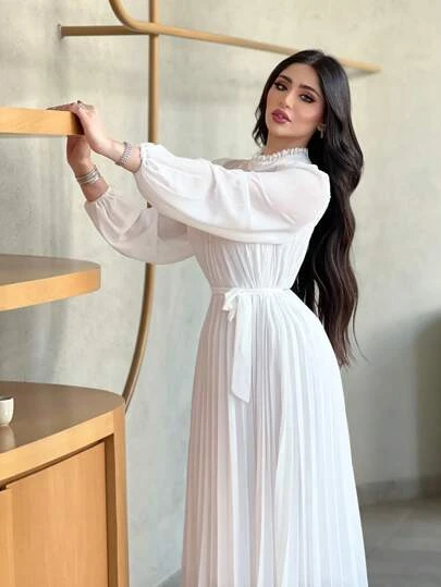 SHEIN Modely Mock Neck Lantern Sleeve Belted Pleated Hem Dress