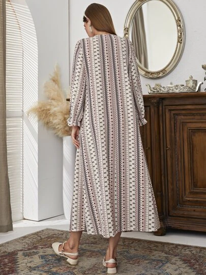 SHEIN Najma Floral & Geo Print Flounce Sleeve Tassel Trim Tie Neck Dress