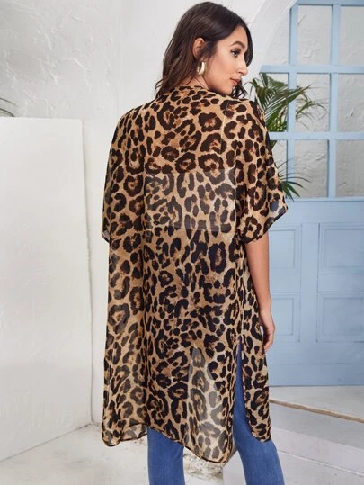SHEIN Open Front Split Hem Leopard Chiffon Kimono