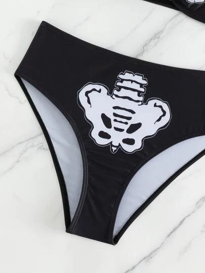 SHEIN Skeleton Print Bikini Set Halter Bra & High Waisted Bottom 2 Piece Gothic Swimsuit
