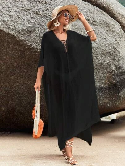 SHEIN Solid Lace Up Front Split Thigh Cover Up Dress