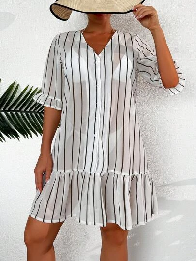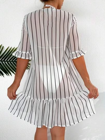 SHEIN Striped Print Flounce Sleeve Ruffle Hem Cover Up Dress