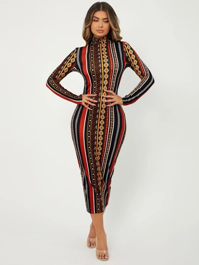 SHEIN SXY Geo & Striped Print Bodycon Dress