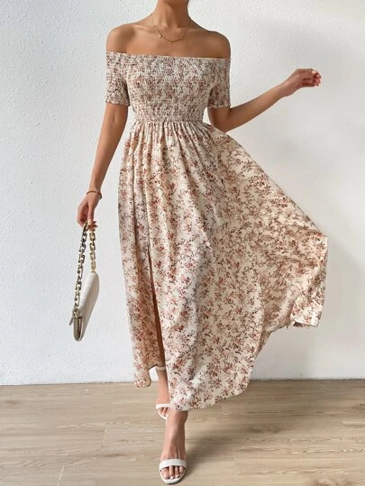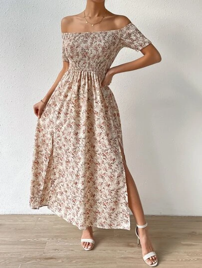 SHEIN VCAY Allover Floral Print Off Shoulder Split Thigh Dress
