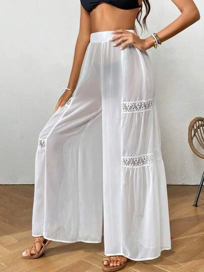 SHEIN VCAY Contrast Lace Ruffle Hem Cover Up Pants Without Bikini Bottom