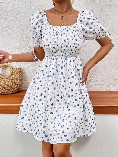 SHEIN VCAY Ditsy Floral Print Knot Cuff Puff Sleeve Dress
