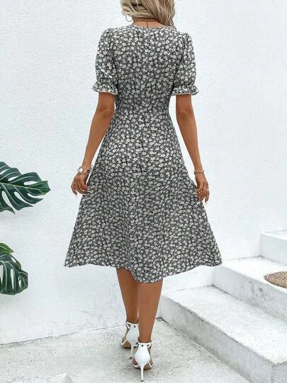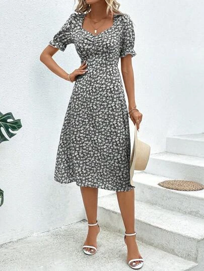 SHEIN VCAY Ditsy Floral Print Sweetheart Neck Puff Sleeve Dress