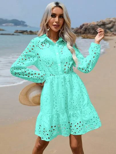 SHEIN VCAY Eyelet Embroidery Ruffle Hem Shirt Dress