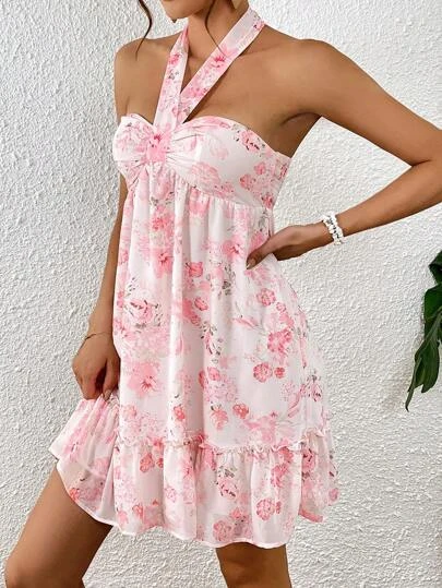 SHEIN VCAY Floral Print Halter Neck Backless Ruched Bust Ruffle Hem Dress